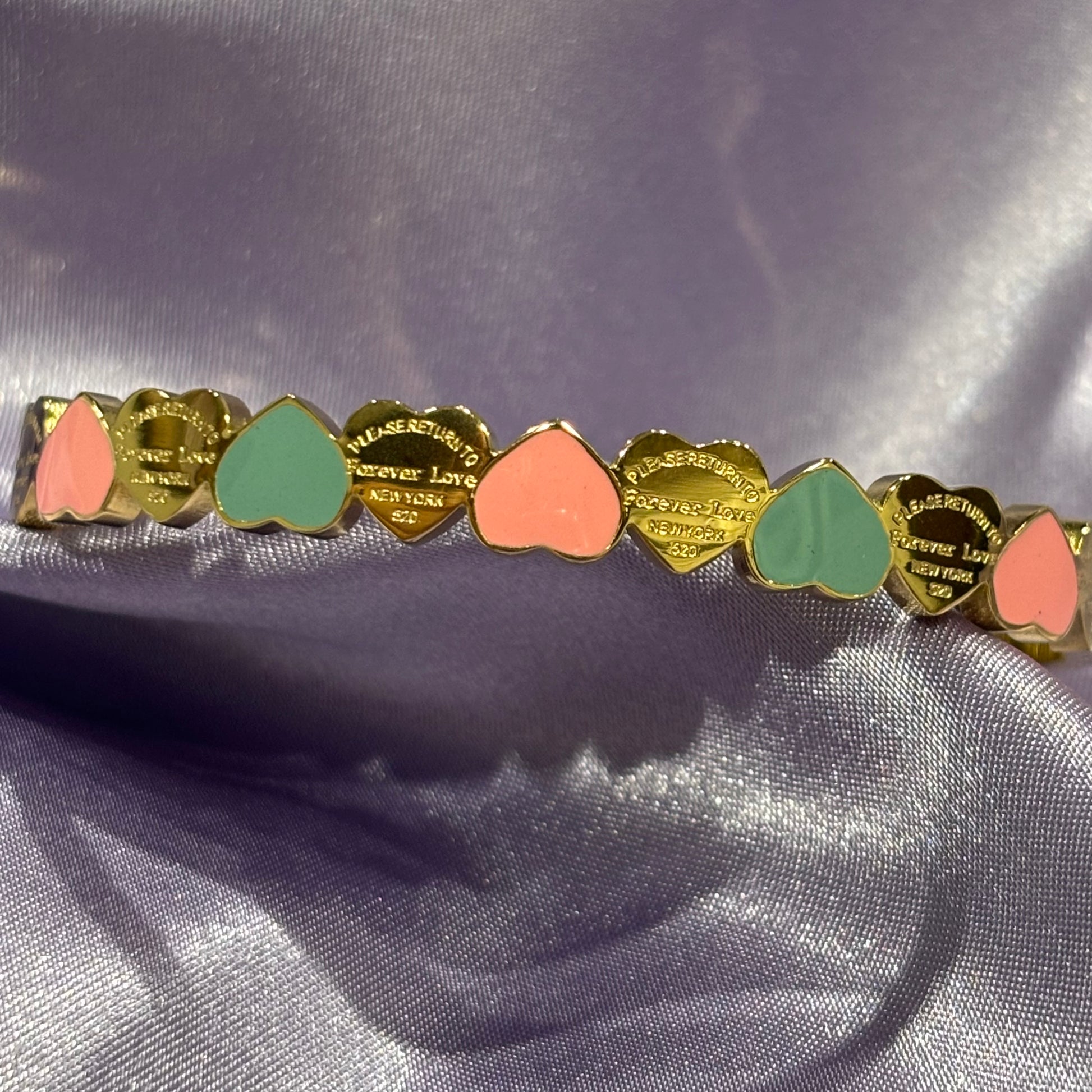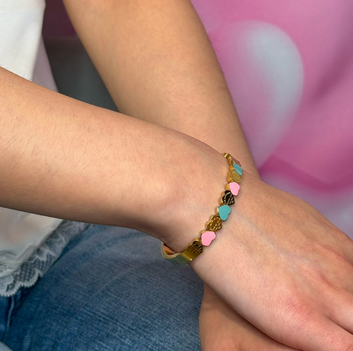 Indulge in luxury with Collect Your Hearts, a stunning pink, blue, and gold bracelet. Elevate any outfit and showcase your unique style with this gorgeous piece. Embrace the beauty and stand out from the crowd. Don't miss out, get yours today!