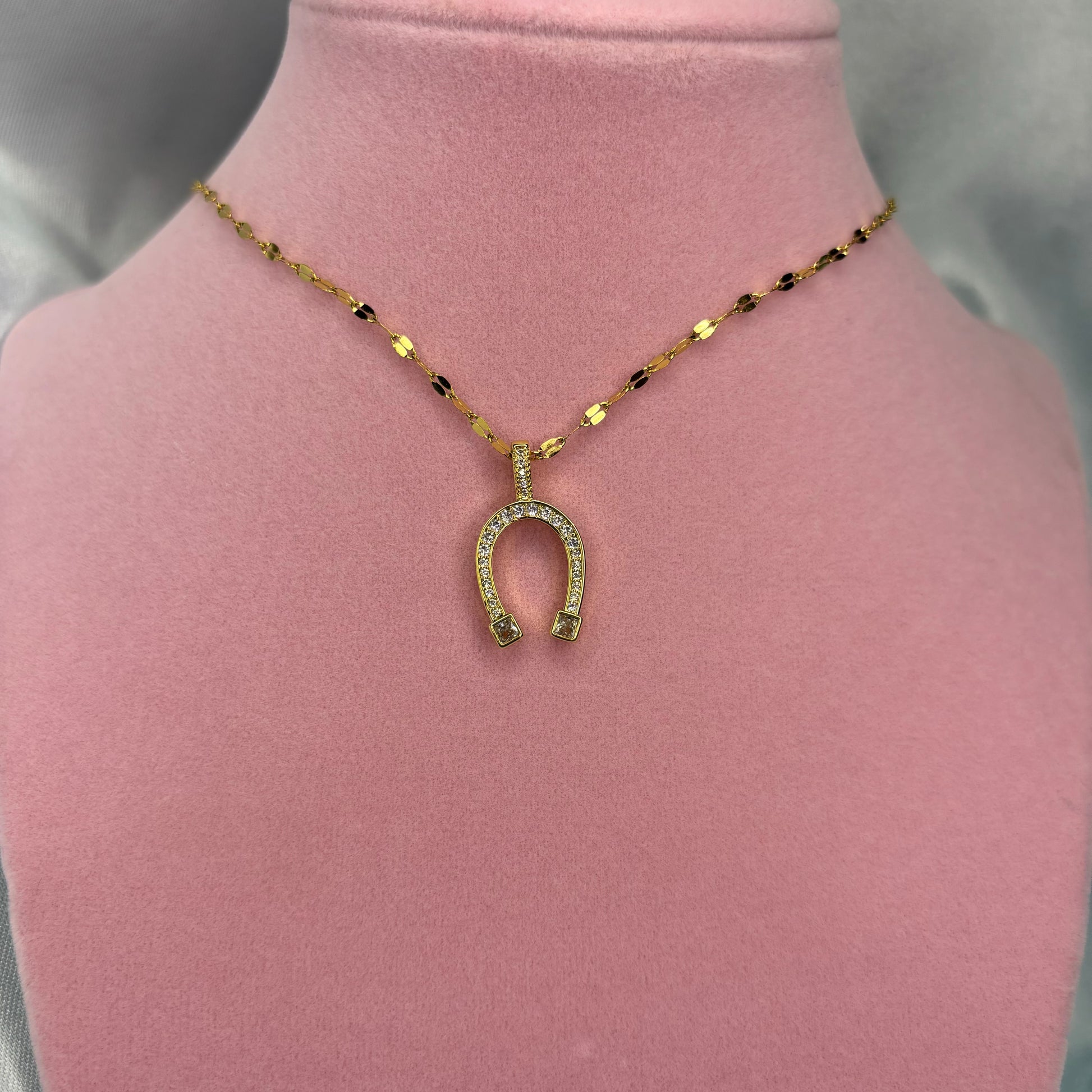 The Lucky Me necklace features a stunning gold horseshoe pendant, adding a touch of luck and charm to any outfit. Crafted with high quality materials, this necklace is not only stylish, but also durable. Perfect for any occasion.