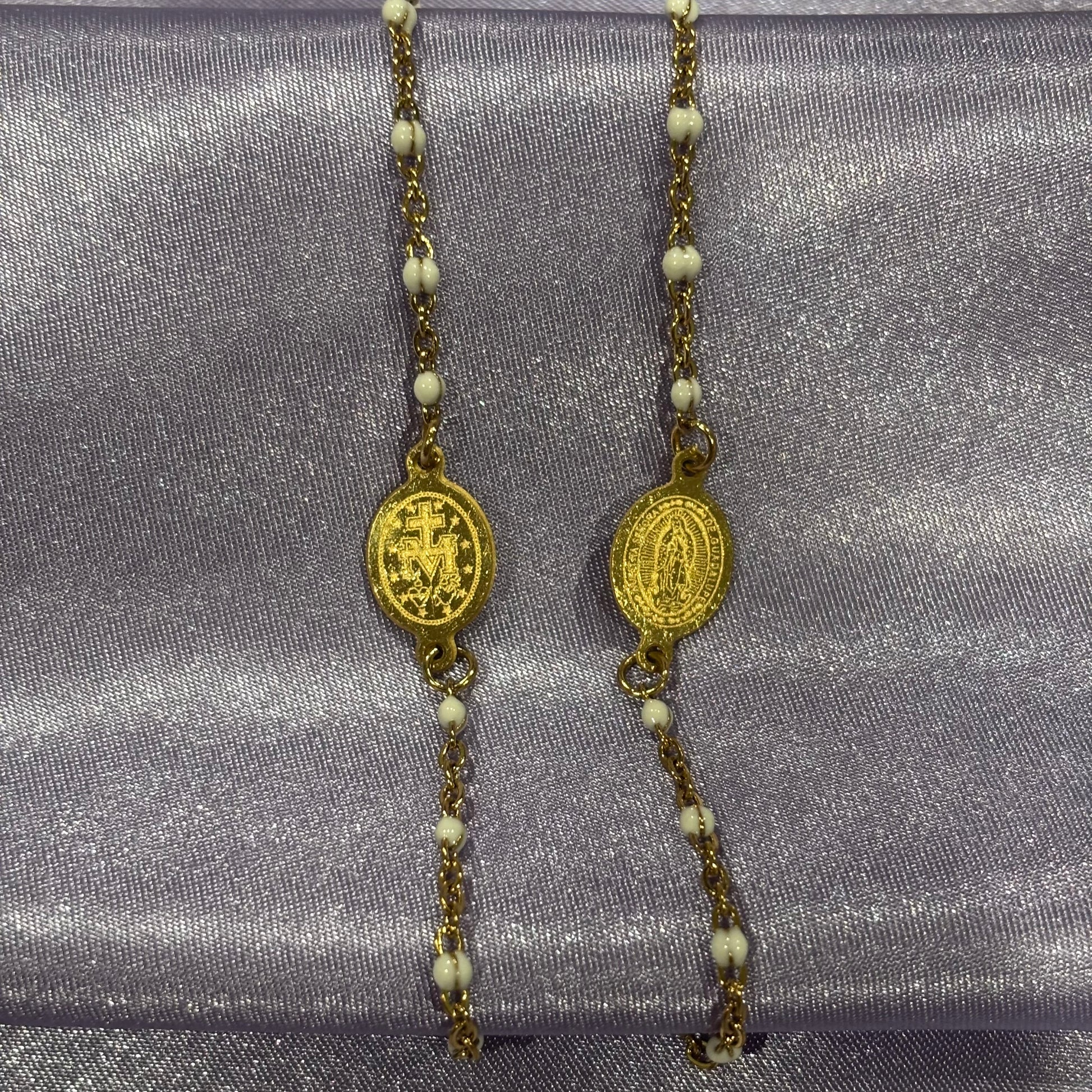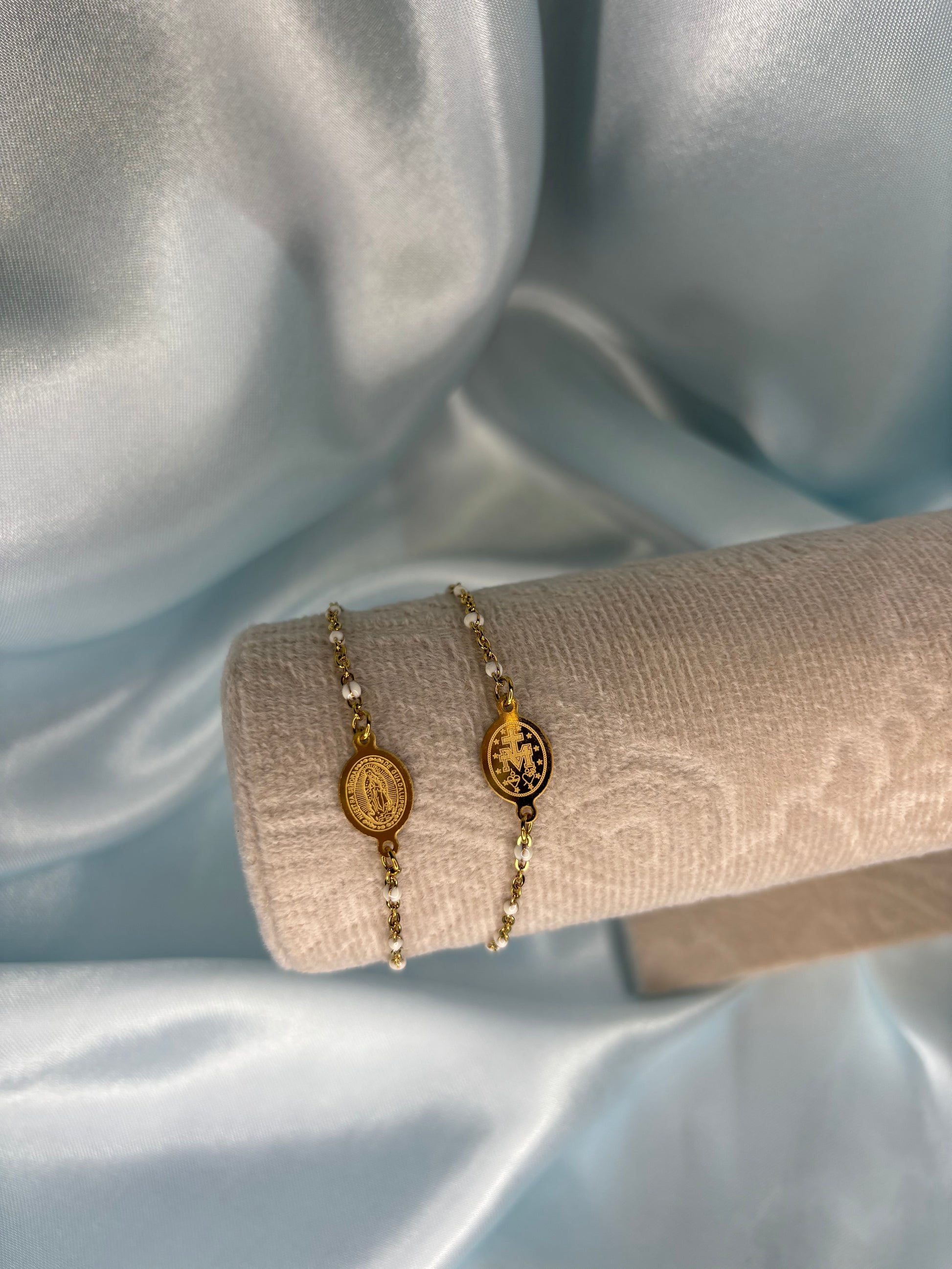 This bracelet features a delicate design of the Virgin Mary in 18k gold, adorned with beautiful pearls. Show your devotion and add a touch of elegance to your outfit with this unique piece. Crafted with quality materials, this bracelet is a timeless addition to any jewelry collection.