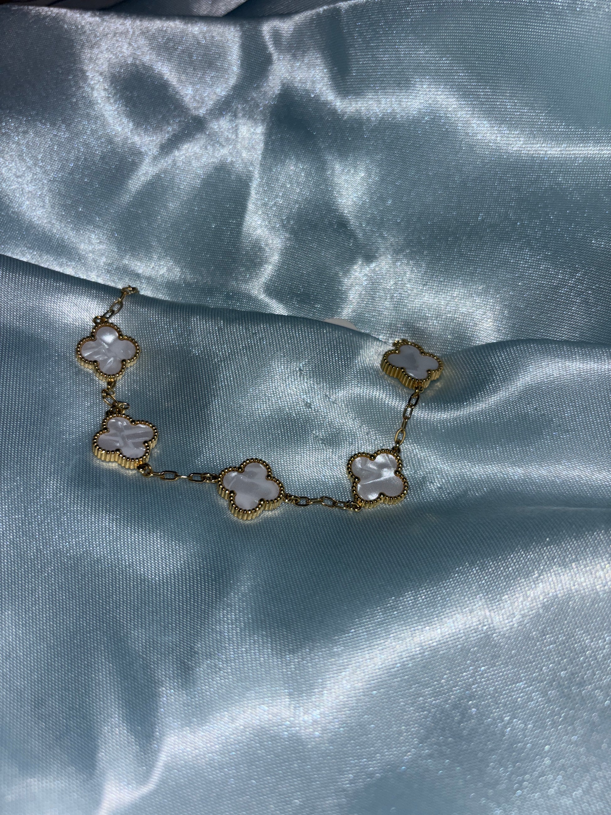 Indulge in an exciting accessory with our beautiful White Clover daring bracelet. The delicate white clover design adds a touch of elegance to any outfit, making it the perfect statement piece for any occasion. Elevate your style and showcase your boldness with this stunning bracelet.